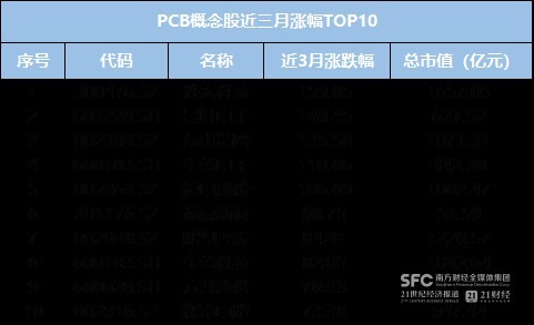 与此同时,PCB板块行情持续火热。据统计,近三个月以来,胜宏科技、景旺电子、东山精密、生益电子、沪电股份等5家公司已实现股价翻倍,此外,逸豪新材近三月涨幅98.75%,接近翻倍。值得注意的是,在这一波大行情下,PCB板块已催生出了胜宏科技、鹏鼎控股、沪电股份、东山精密、生益科技等市值千亿龙头。
